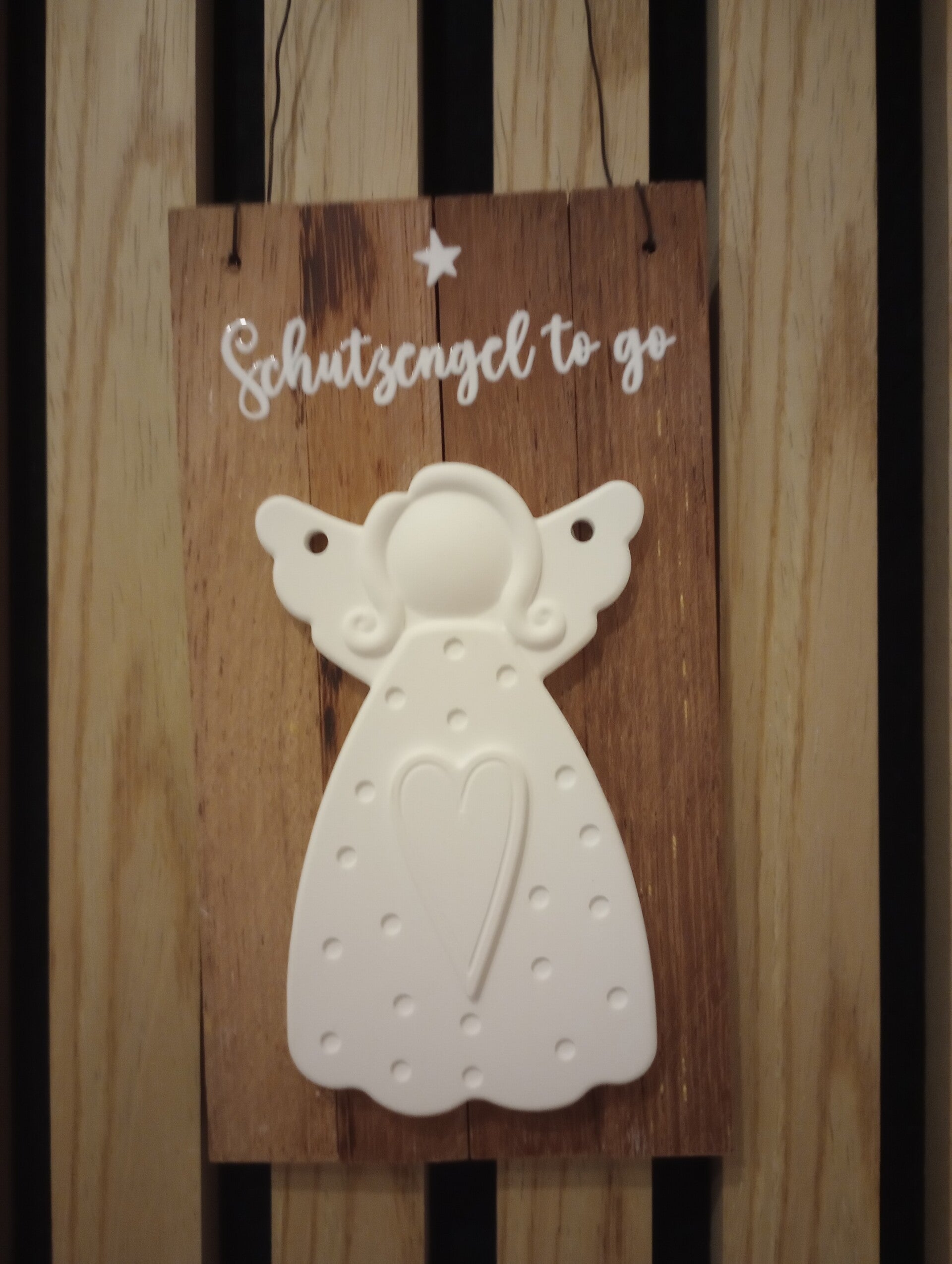 Süßer Schutzengel aus Kercraft auf Baumbusbrettchen zum Aufhängen.